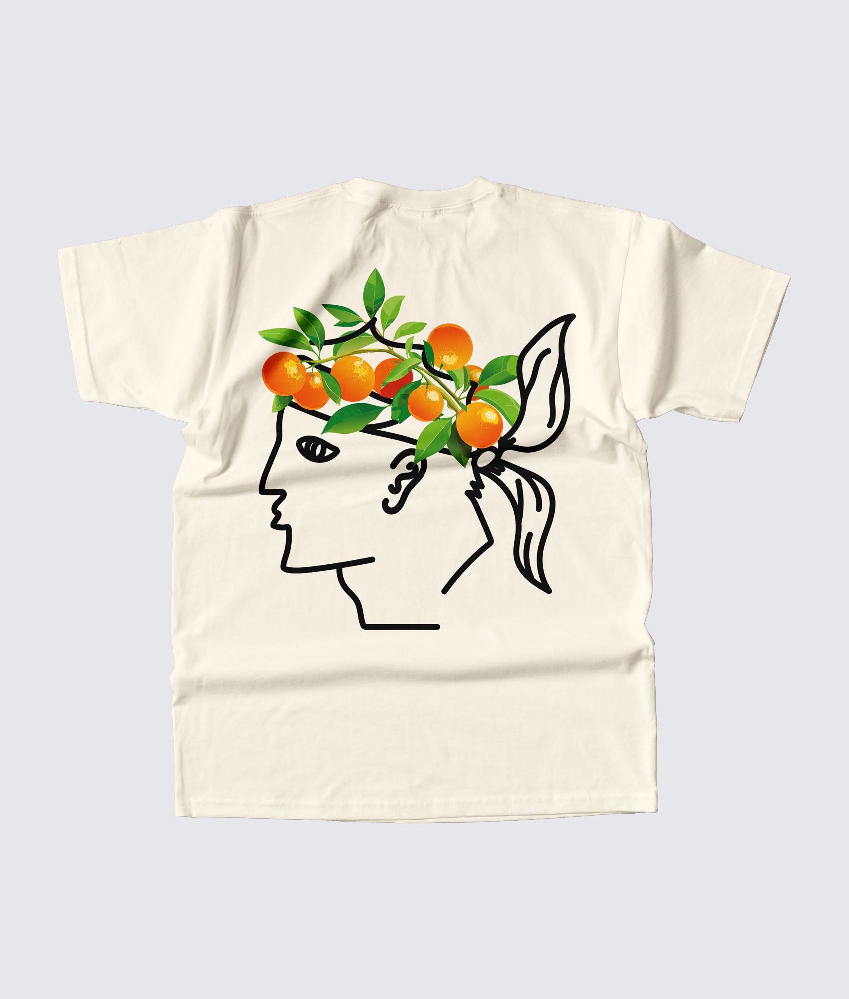 La couleur écrue du t-shirt apporte une douceur naturelle qui amplifie la chaleur du visuel, comme un fond de papier ancien sur lequel viendrait s'imprimer une enluminure.