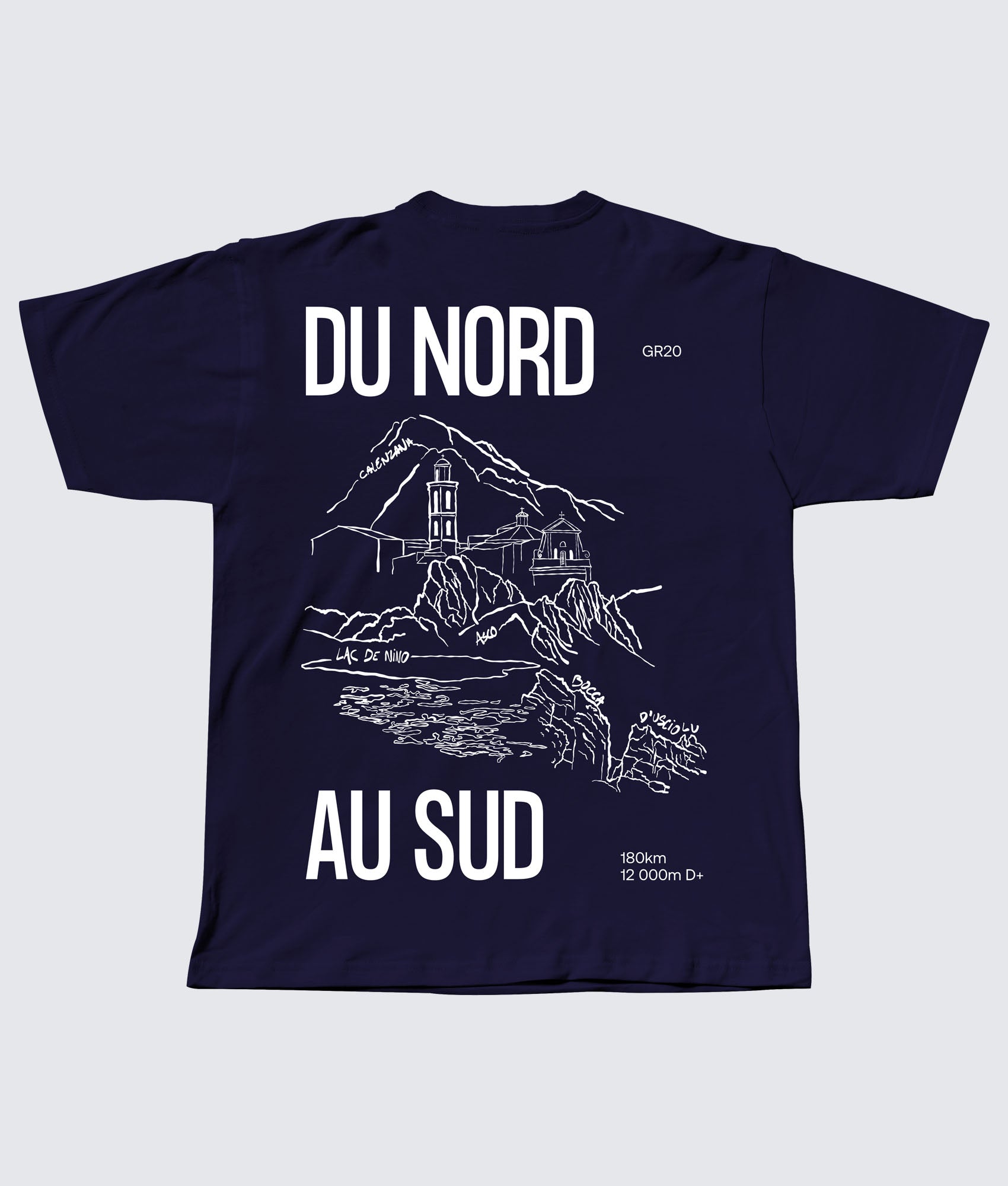 Le graphisme sérigraphié en grand format dos raconte ce voyage en une seule image : Calenzana et son clocher au départ, le Lac de Nino au cœur de l'île, l'Asco, la Bocca d'Usciolu à l'arrivée. Des noms annotés à la main sur le dessin, comme sur une carte griffonnée avant le départ. La typographie massive — DU NORD en haut, AU SUD en bas — encadre l'illustration avec la force d'un état d'esprit.
