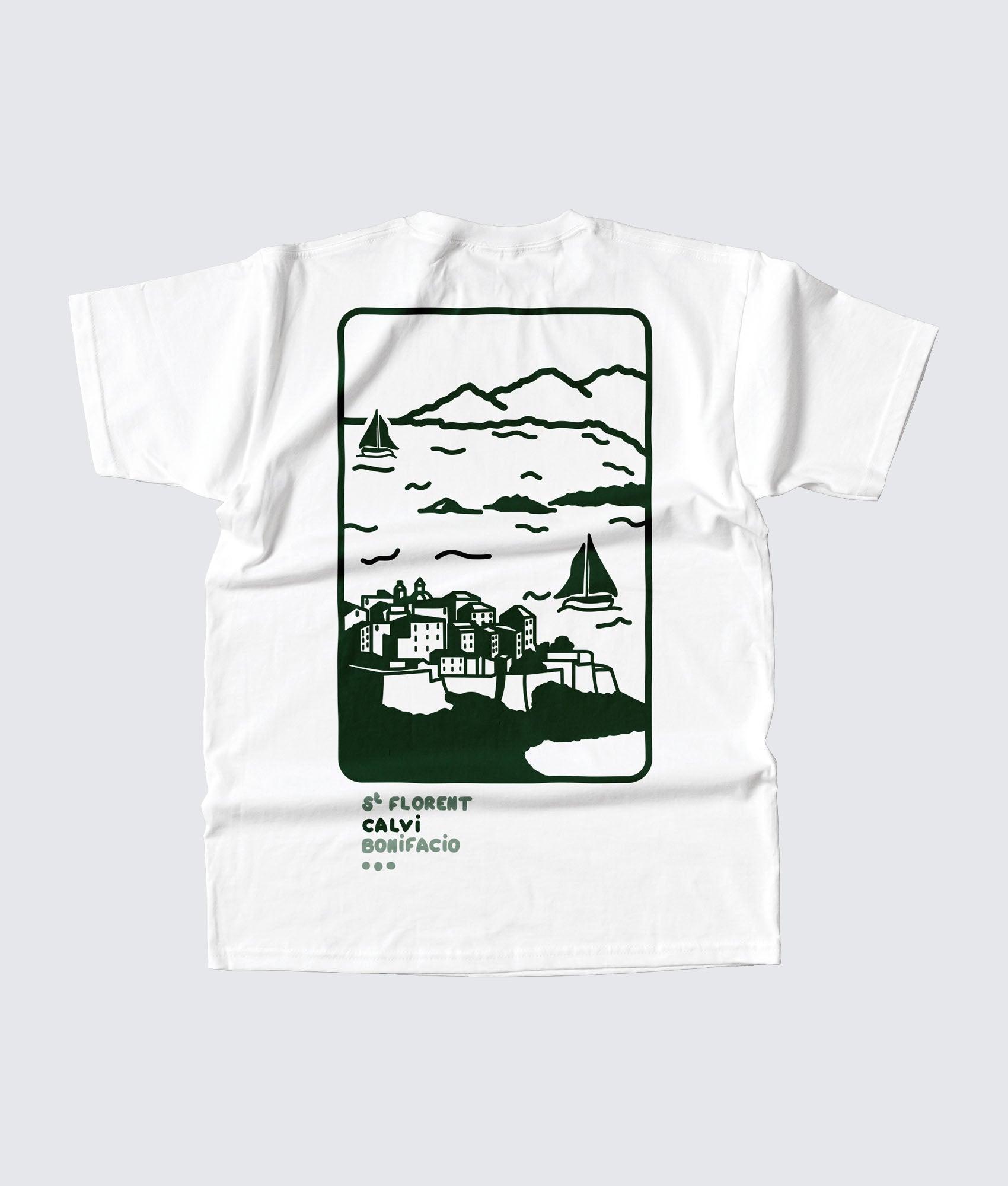 Le graphisme sérigraphié en grand format dos restitue cette vue avec un style illustration plat et généreux, tout en vert forêt sur fond blanc. La citadelle, les maisons serrées les unes contre les autres, les voiliers sur l'eau, les montagnes en fond de scène — une composition qui évoque à la fois l'affiche de voyage vintage et la carte postale dessinée à la main. En bas, la trilogie des escales corses : St Florent, Calvi, Bonifacio.