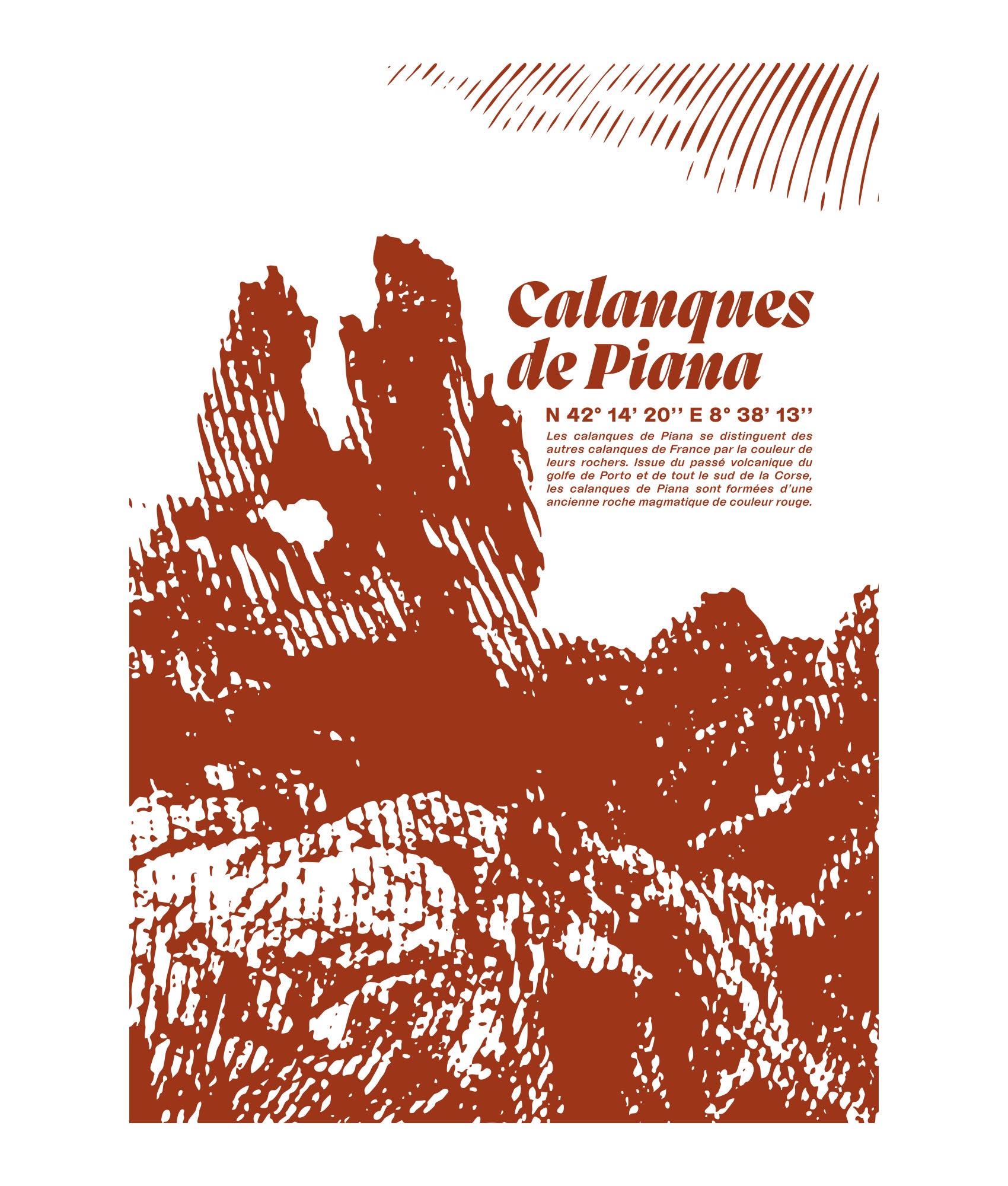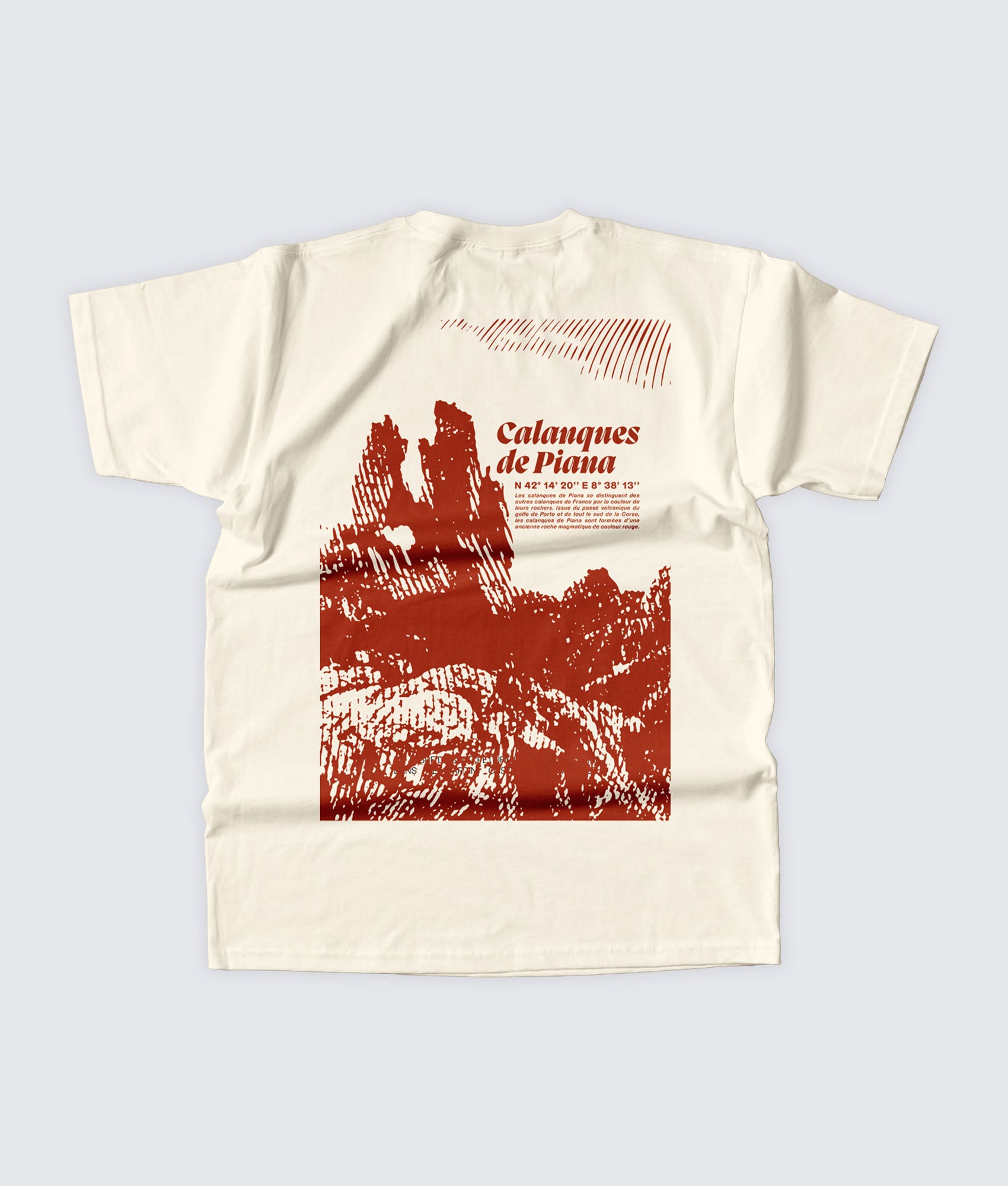 Ce graphisme sérigraphié en grand format dos restitue la puissance minérale du site : falaises sculptées par le temps, aiguilles de roche dressées vers le ciel, rendu texturé qui rappelle l'estampe et la gravure. Une image entre cartographie et contemplation.