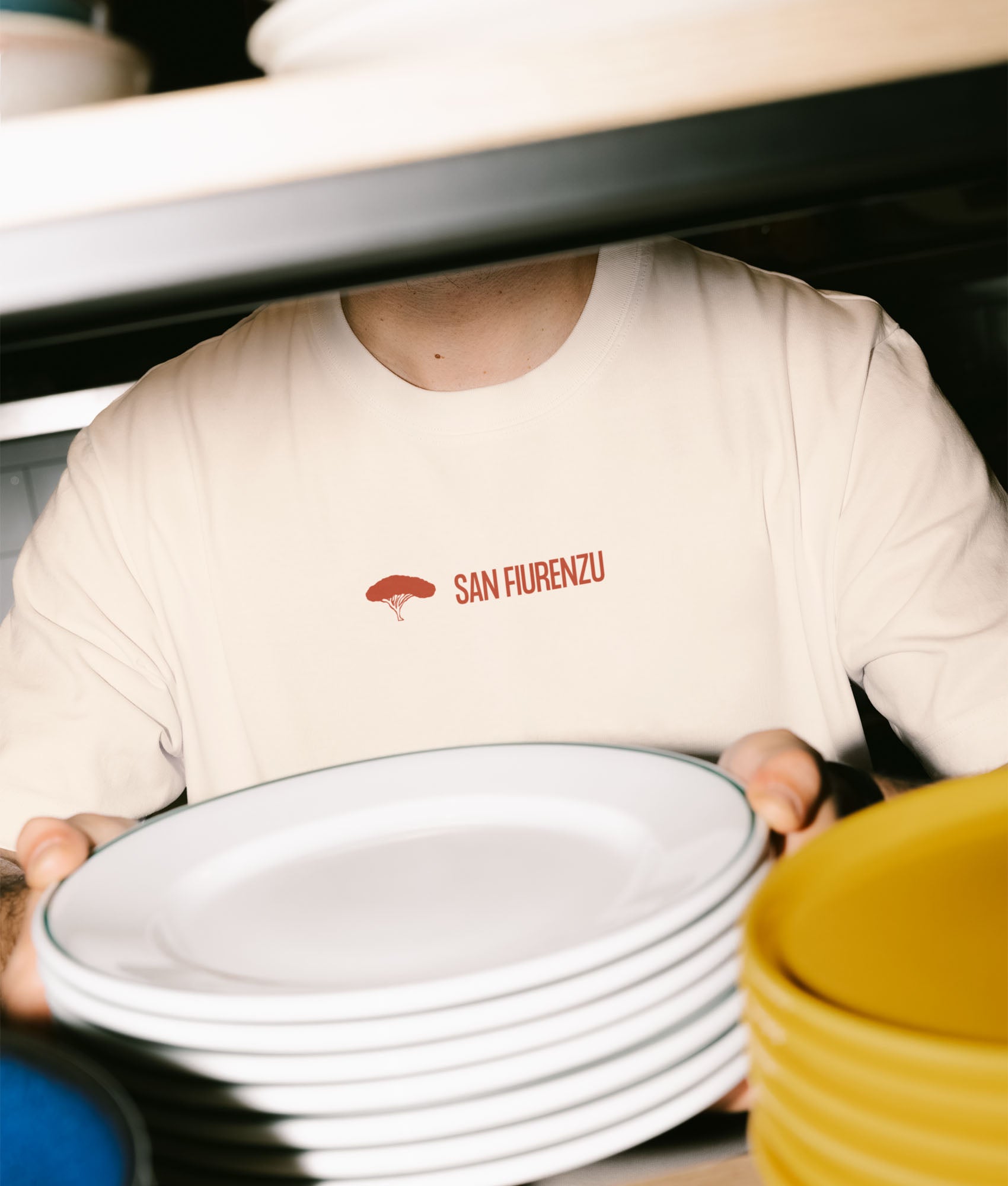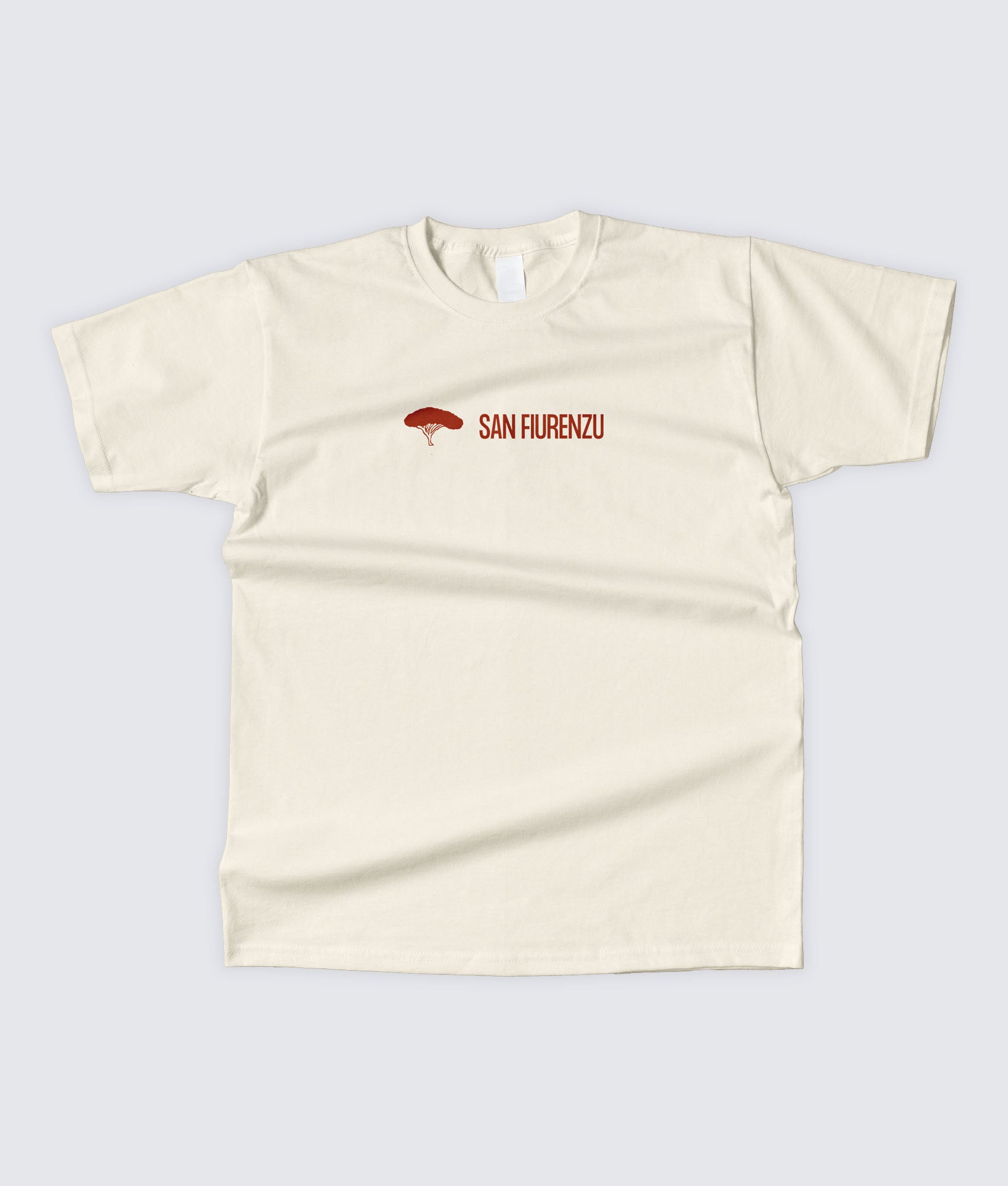 La couleur naturelle du t-shirt — un écru chaud — dialogue avec les tonalités terreuses du visuel. Discret en façade avec le logo SAN FIURENZU brodé sur la poitrine, radical dans le dos.